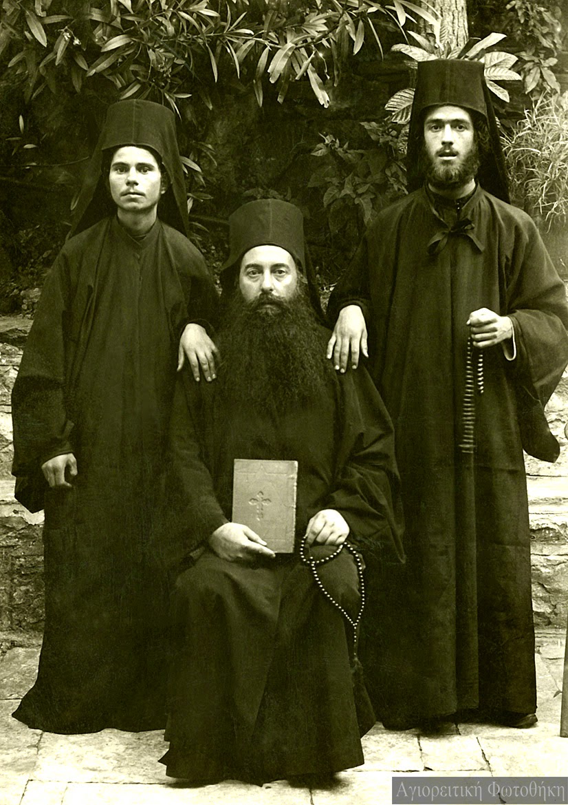 Ctihodný jeromonach Anthimos ze Svaté Anny (1913-1996) jako mladý mnich (vlevo)