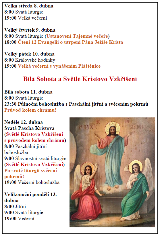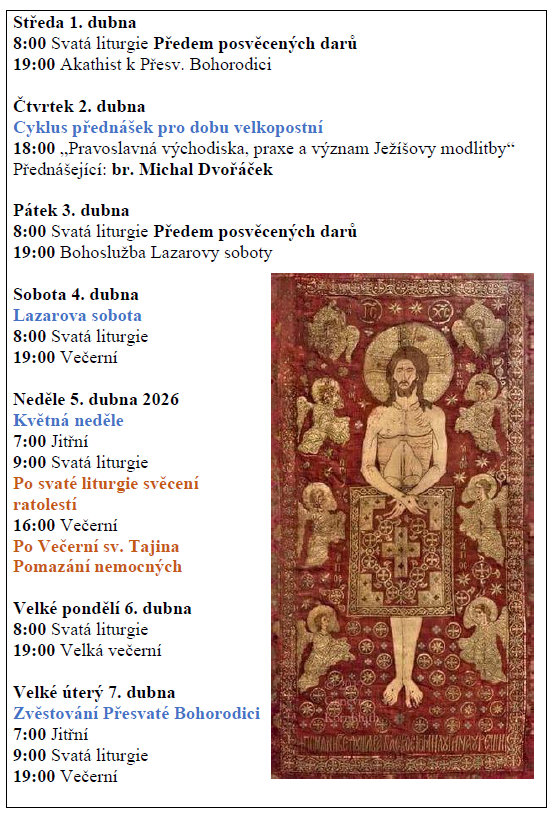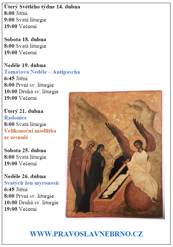 Aktuality/Pravoslaví Program bohoslužeb na duben, kdy oslavíme svátek všech svátků – Paschu Kristovu Publikováno 28 března, 2026 od autora: Michal Dvořáček / 0 komentářů Program bohoslužeb Brněnské PCO na duben 2026_Pascha Sdílejte: Sdílet na X (Otevře se v novém okně) X Sdílet na Facebooku (Otevře se v novém okně) Facebook Michal Dvořáček Zobrazit veškeré příspěvky od Michal Dvořáček →